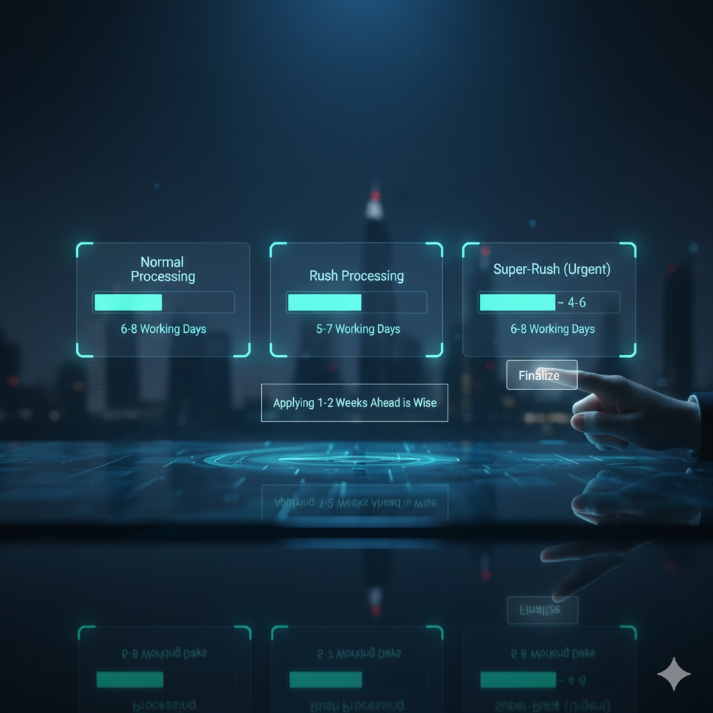 It shows processing-time options in a clear way: standard, rush, super-rush — useful for travellers who have tight schedules and need speed.