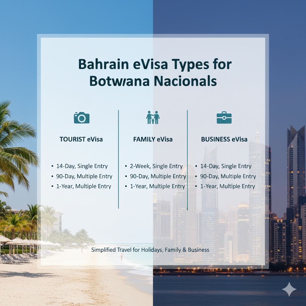 If you’re a Botswana national, you have a variety of Bahrain Visa types to choose from depending on your travel purpose. The main categories (as per your reference list) are:
