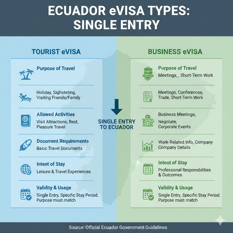 A tourist eVisa and a business Ecuador eVisa are two types of visas that allow a single entry to the country. The difference between them is as follows: