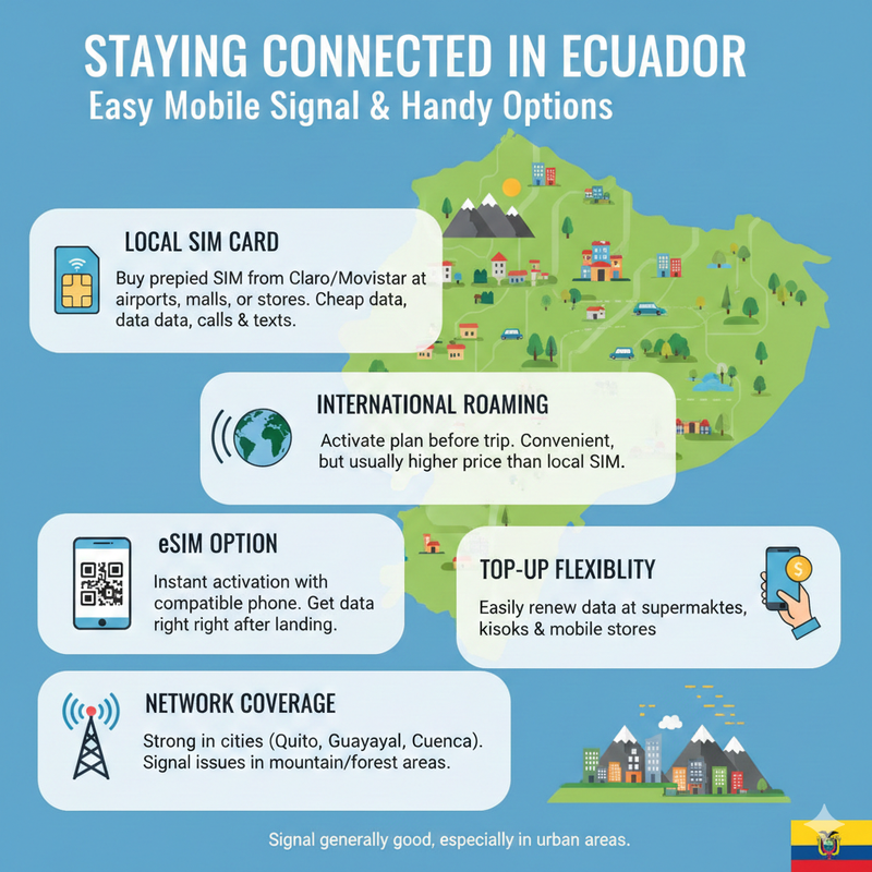 - Top-up flexibility: Ecuador SIM cards permit easy top-ups at supermarkets, kiosks, and mobile stores, therefore, you can renew your data whenever it is needed.