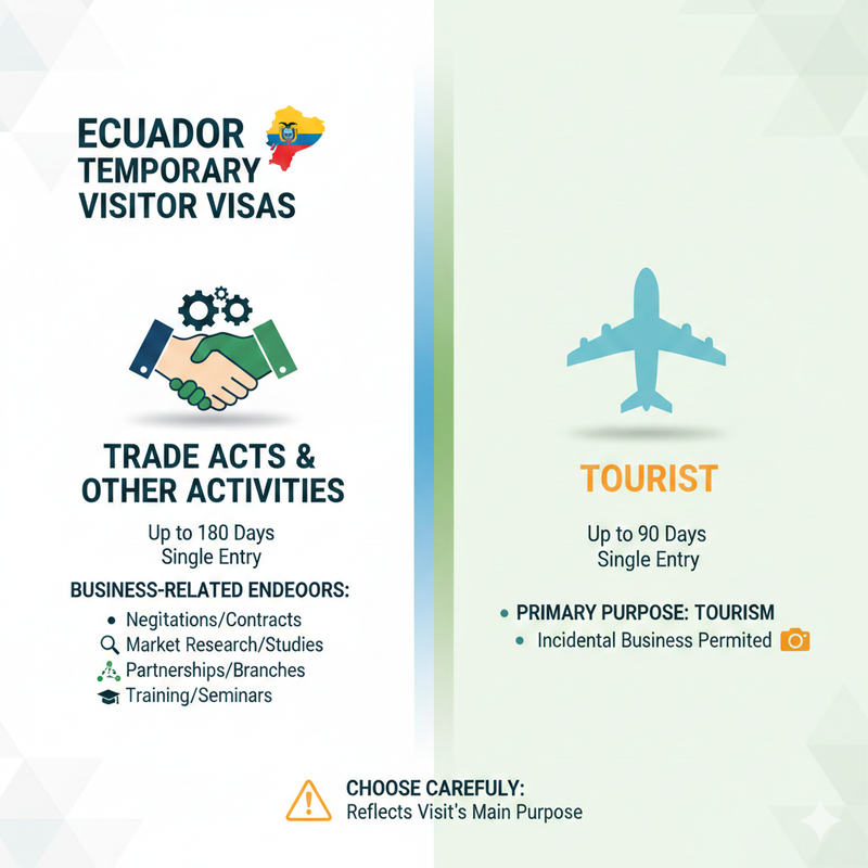 For individuals intending to engage in trade acts and other professional activities, Ecuador offers a Temporary Visitor Trade Acts & Other Activities visa. This category allows for a stay of up to 180 days with a single entry. This option is ideal for those involved in various business-related endeavors, such as: