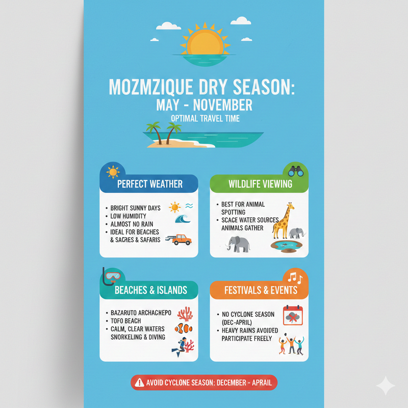 The optimal time to see Mozambique is during the dry season when the weather is usually nice from May to November.